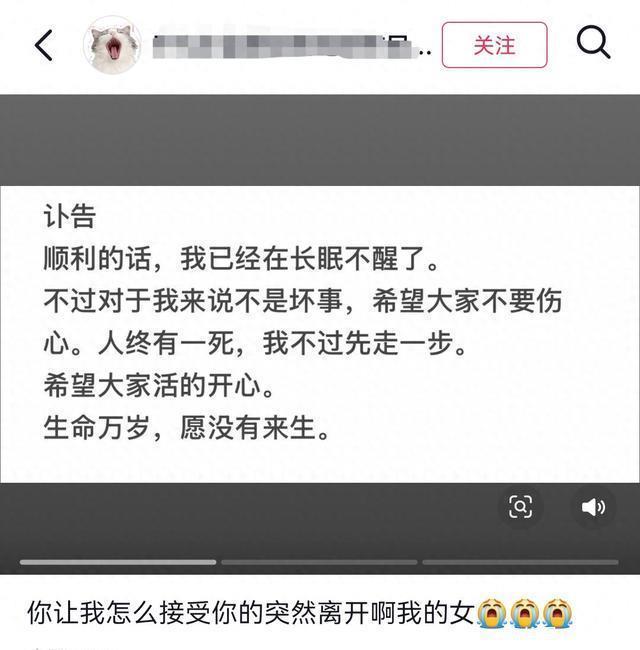 但从这简短的讣告还是能看出她有明显的厌世情绪,生命万岁,但她并不想有来生!所以选择了轻生,用离开来与现实和解。 可这对亲人来说是无法面对的,母亲将女儿从小拉扯大,原以为她可以展翅高飞,找到属于自己的人生了,结果她选择了离开。