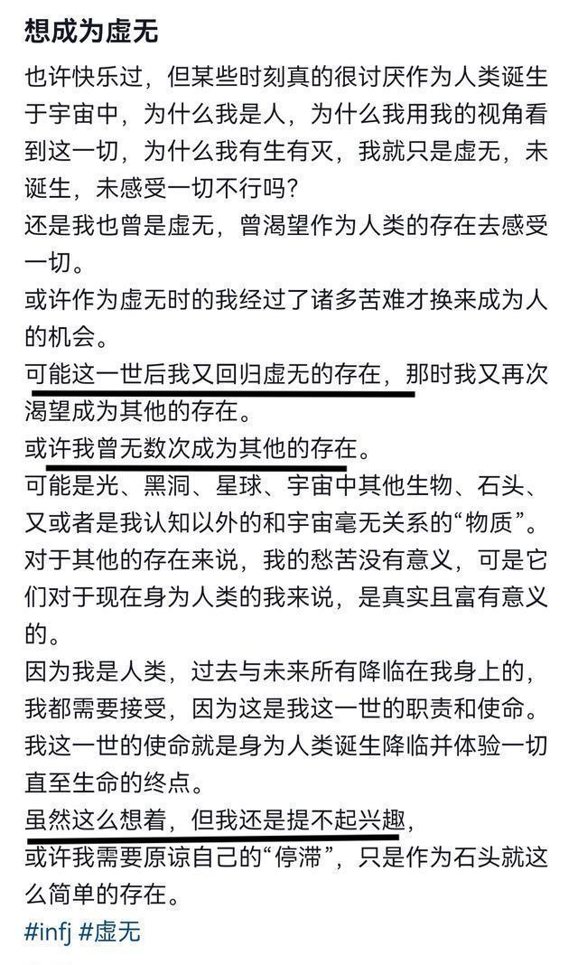 就在上个月底,小枝还发了一段很长的文字,但一般人都难以理解到底在说什么,其实这段文字的核心意思就是她已经对生活失去了兴趣,想要成为“虚无”的存在。