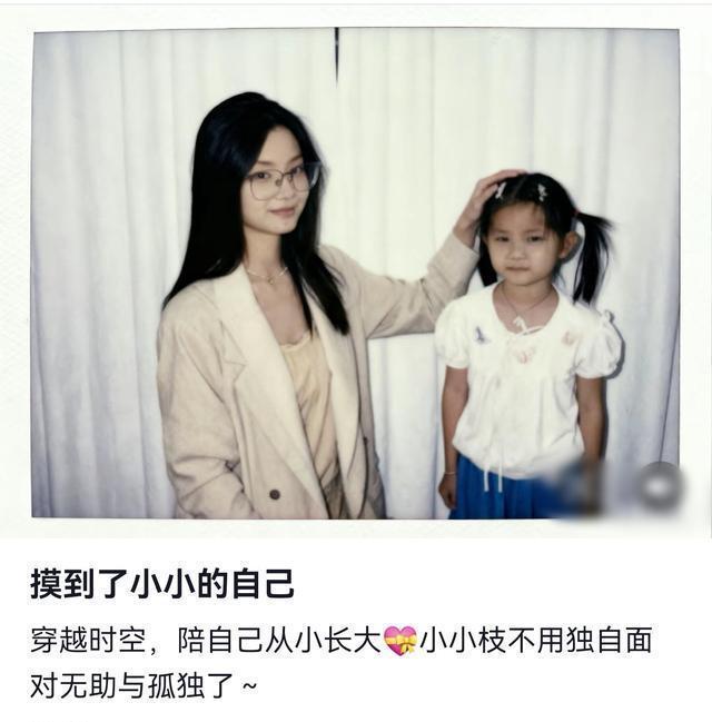 另外,小枝上个月还用软件生成了一张和小时候的自己合影的图片,称她触摸到了小小的自己,穿越时空,陪自己从小长大,小小枝不用独自面对无助和孤独了!