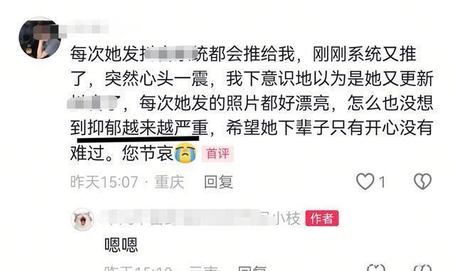 可常识告诉我们,小枝的决绝和离开真的是过去几个小时内的决定吗? 这不符合逻辑,事出必有因,在如此美好的年龄放弃生命,大概率是无法承受长期的煎熬所致,值得关注的是,在评论区有一位长期关注小枝的朋友透露,小枝有严重的抑郁问题。